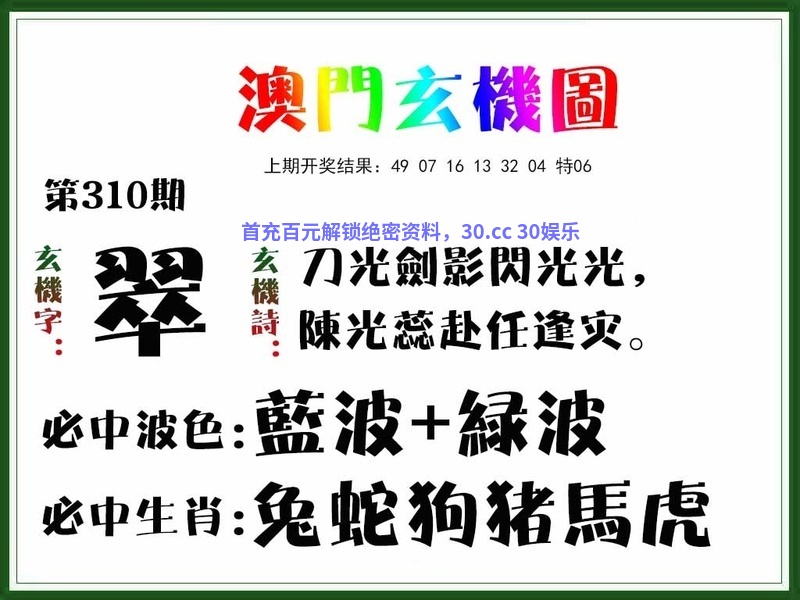 玄机诗:刀光劍影閃光光,陳光蕊赴任逢灾。 必中波色:蓝波+绿波 必中生肖:兔蛇狗猪马虎 |